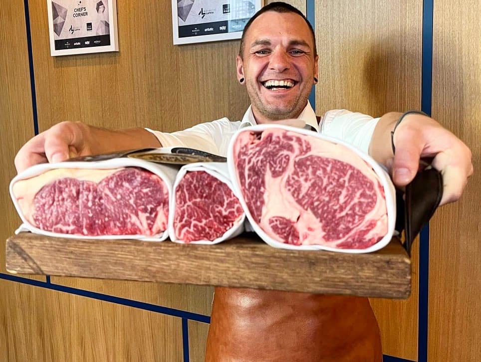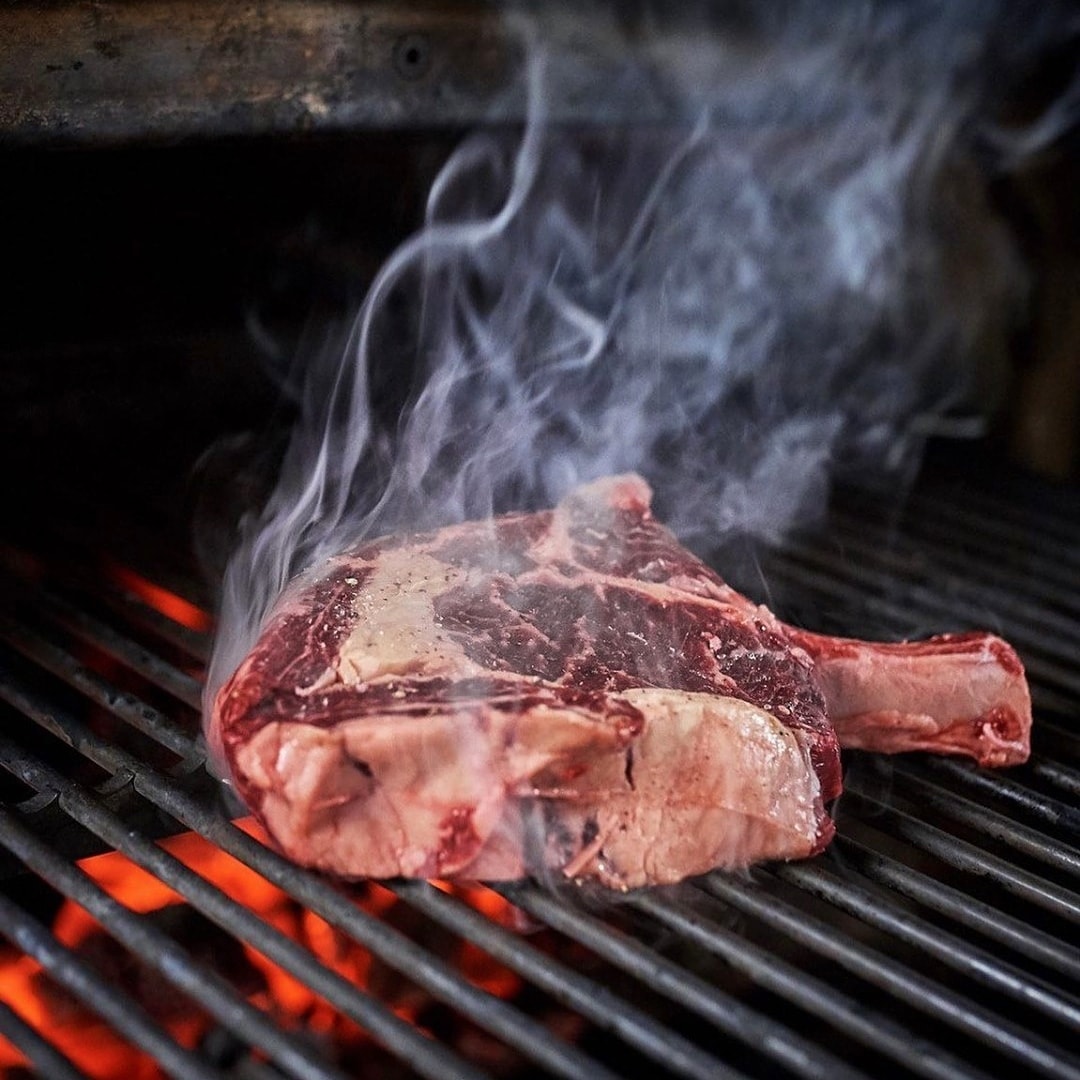 Signature dishes: Tomahawk grilled long-bone rib steak, smoked eggplant carpaccio with Roquefort cream