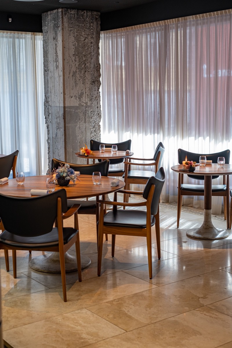 The restaurant embodies Scandinavian refinement with its minimalist yet warm interior design. Every table serves as a chef’s table, allowing guests to witness the theatrical precision of the culinary team as they craft each course. The open kitchen takes center stage in the elegant dining room, featuring polished wood tables, leather chairs, and soft candlelight filtered through sheer curtains.