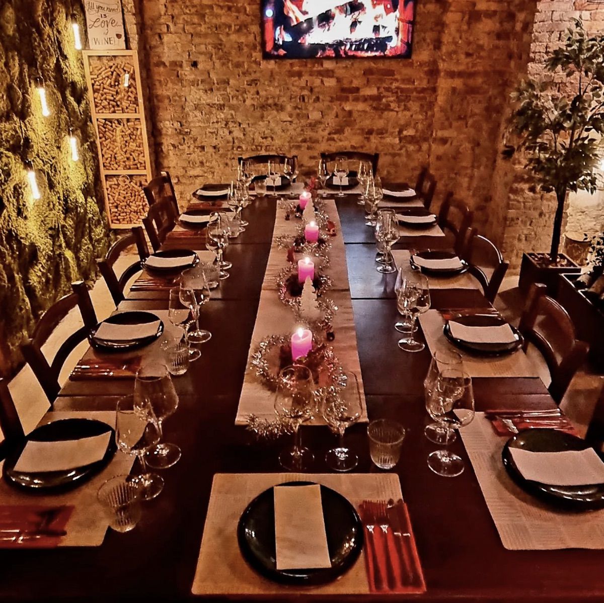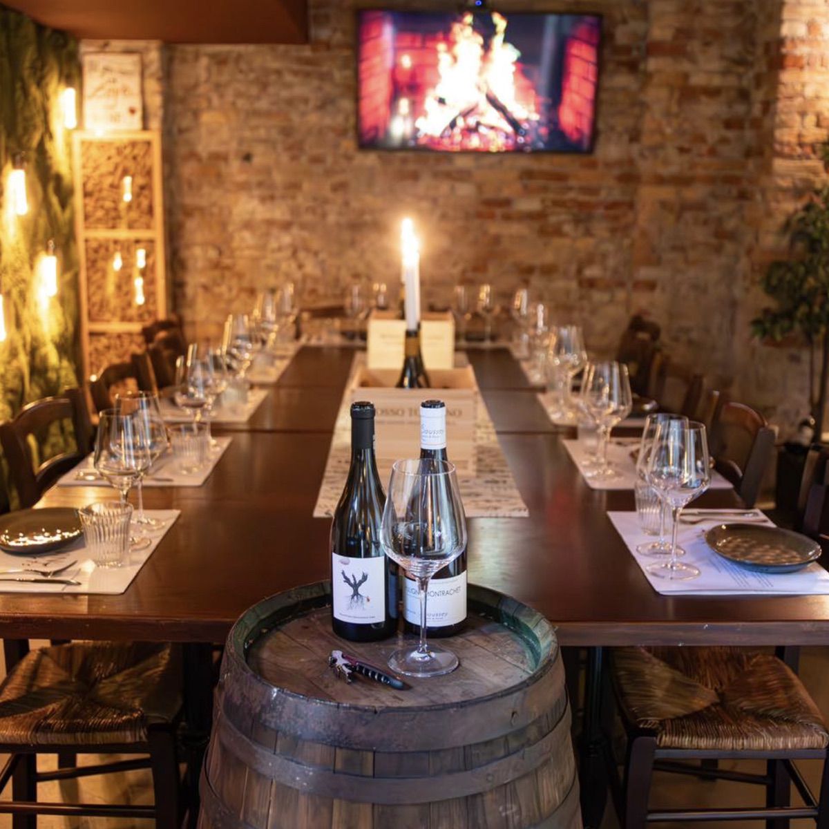 Private Cellar: An exclusive Tuscan-inspired underground space accommodating up to 24 seated guests, featuring exposed brick, wine barrel decor, candlelight, and an intimate atmosphere perfect for private wine tastings and special celebrations.