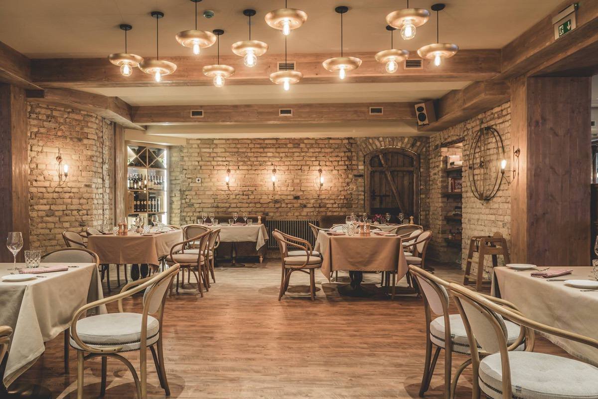 Italissimo is an Italian restaurant located in central Riga on Baznīcas Street. The venue spans two floors and accommodates approximately 100 guests. The interior features exposed brick walls, light wood elements, and modern lighting fixtures.