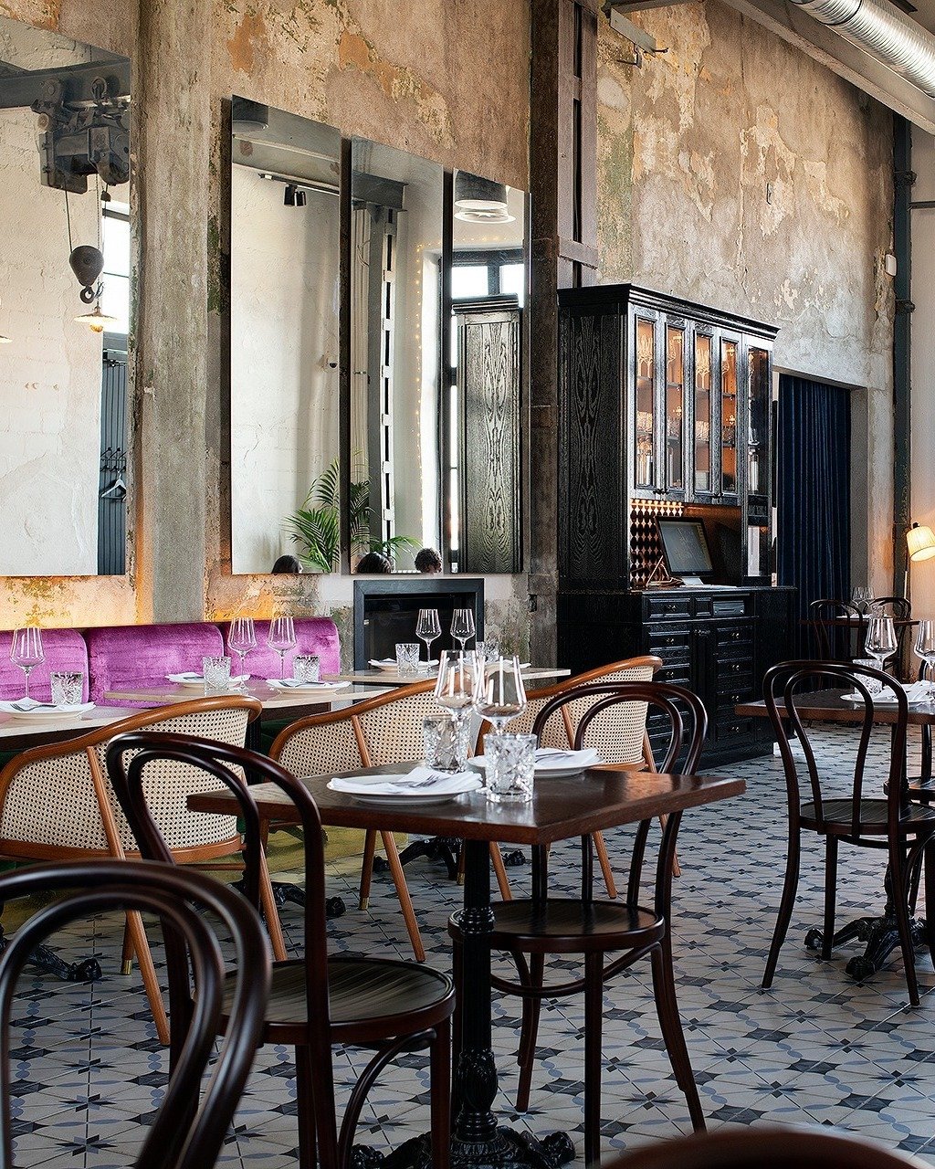 Lore Bistroo is a modern bistro located in Port Noblessner’s historic shipyard building, which also houses the Kai Art Center. The venue features an industrial aesthetic with exposed steel girders, concrete pillars, and original hoists from the building’s past as part of an Imperial Russian submarine shipyard. A tiled fireplace and wicker chandeliers add warmth to the warehouse space.
