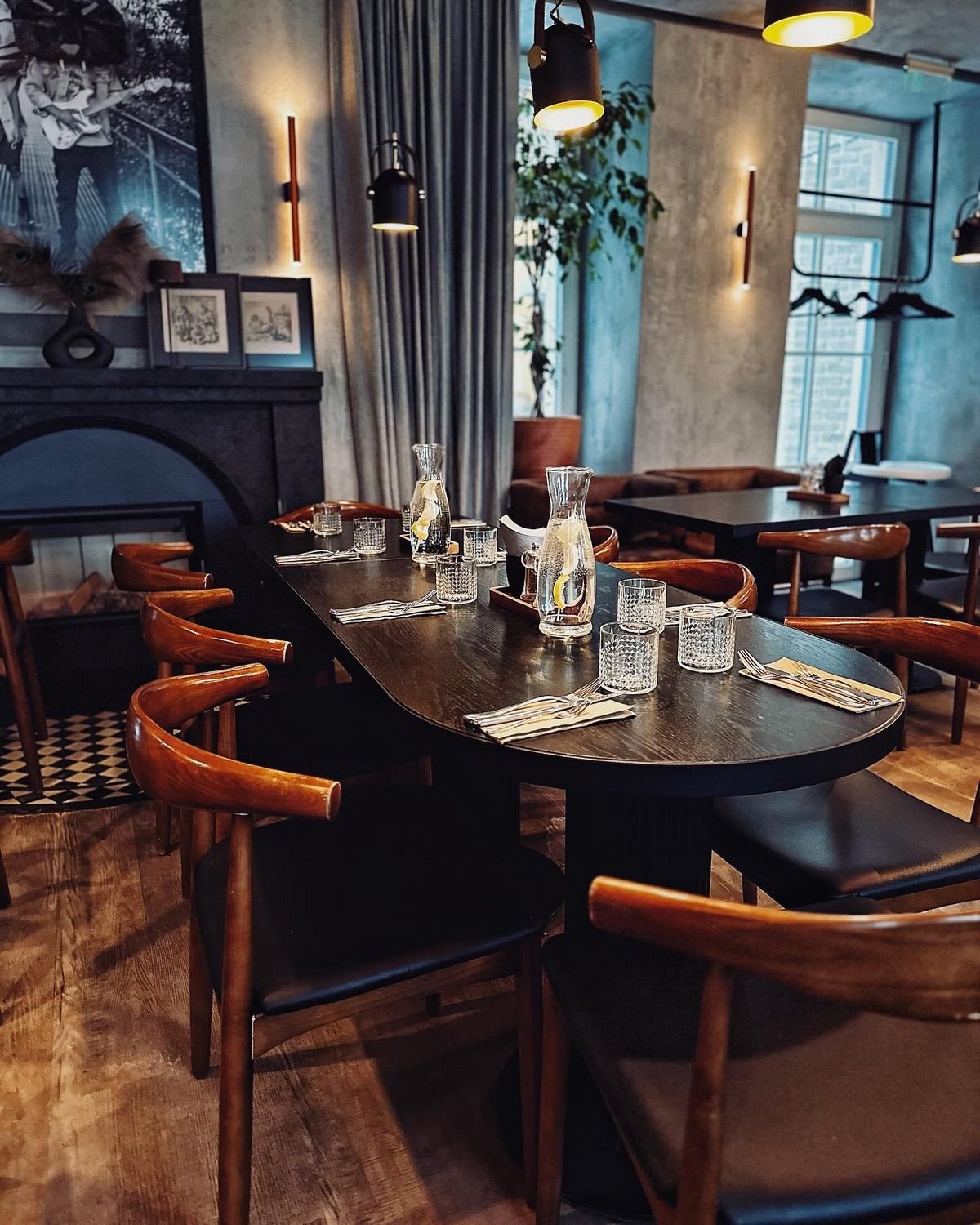 Meat Lovers Vilnius is a modern grill restaurant located in Vilnius Old Town on Liejyklos Street. The venue features contemporary interior design with a mix of industrial and elegant elements, including distinctive textured chandeliers, exposed concrete walls, and warm lighting. The dining space combines dark wood tables with comfortable leather seating and decorative details such as mounted animal skulls and vintage artwork.